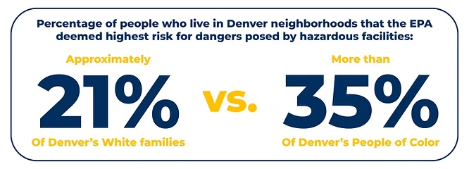 Denver’s historical inequities (read more in Denver’s Equity study, linked here), including land removal from Native Americans, redlining practices, and wealth inequalities, have had a profound impact on the city’s communities, particularly those of People of Color. According to the U.S. Environmental Protection Agency’s Environmental Justice screening system, People of Color are 15% more likely to live in Denver neighborhoods that the EPA deemed highest risk for dangers posed by hazardous facilities.